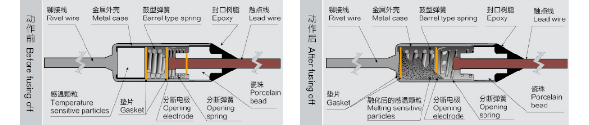 Er bevinden zich openingselektrode, veer en gevoelige deeltjes in de metalen behuizing van de thermische zekering RY. De veer van het tontype wordt samengedrukt om in de behuizing te worden geïnstalleerd. Deze kan met behulp van een pakking contact maken met de stroomdraad. Onder normale omstandigheden stroomt de elektriciteit door de stroomdraad, de openingselektrode, de metalen behuizing en de klinknageldraad.